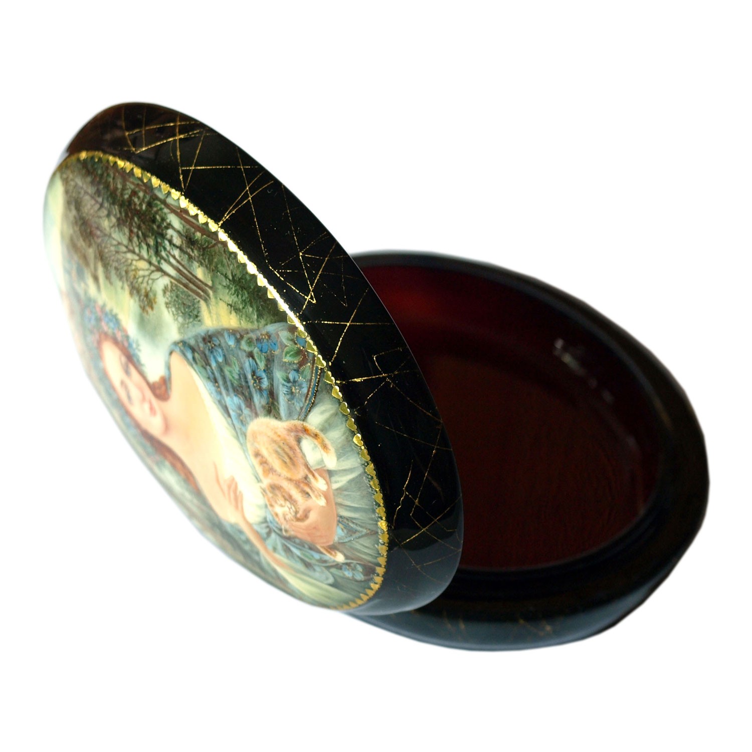 Шкатулка Федоскино - изделие из папье-маше, расписаное масляными красками с использованием сусального зотола и перламутра, покрытое несколькими слоями лака. Федоскинская лаковая миниатюра испольняется масляными красками в три-четыре слоя - последовательно выполняются замалёвок (общий набросок композиции), пропись или перемалёвка (более детальная проработка), лессировка (моделирование изображение прозрачными красками) и бликовка (завершения произведения светлыми красками, передающими блики на предметах).