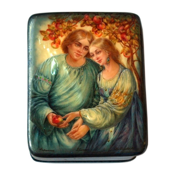 Это нежнейшая лаковая миниатюра, которую вам только доводилось видеть! Жанровая композиция просто прекрасна! Двое молодых влюбленных нежно прижимаются друг к другу и дарят окружающим свою любовь и тепло. Девушка в русском наряде со спокойной, таинственной улыбкой на устах держит за руку своего любимого. Их чувства может увидеть только яблонька, которая раскинула свои ветви над молодой парой. Чистота чувств и легкий душевный порыв так и светятся в глазах молодых возлюбленных. Эта шкатулка Федоскино неповторима, так как неповторимы и чувства двоих людей, изображенных на лаковой миниатюре. Художник постарался передать всю глубину любви, что связывает молодых ребят, всю нежность чувств и дыхание юности, и это у него, по правде сказать, прекрасно получилось!!!
