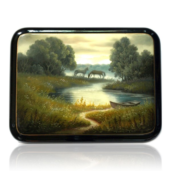 Шкатулку, покрытую блестящим ровным слоем лака, на которой изображен российский летний пейзаж, который передает всю теплоту солнечного денька на речке. Или сюжет вашей любимой русской народной сказки, например "Жар-Птица", где с умелым применением сусального золота картинка выглядит настолько яркой и живой, что кажется будто это происходит прямо сейчас, вызывая в памяти то время, когда вы читали эти сказки на каникулах в младшей школе.