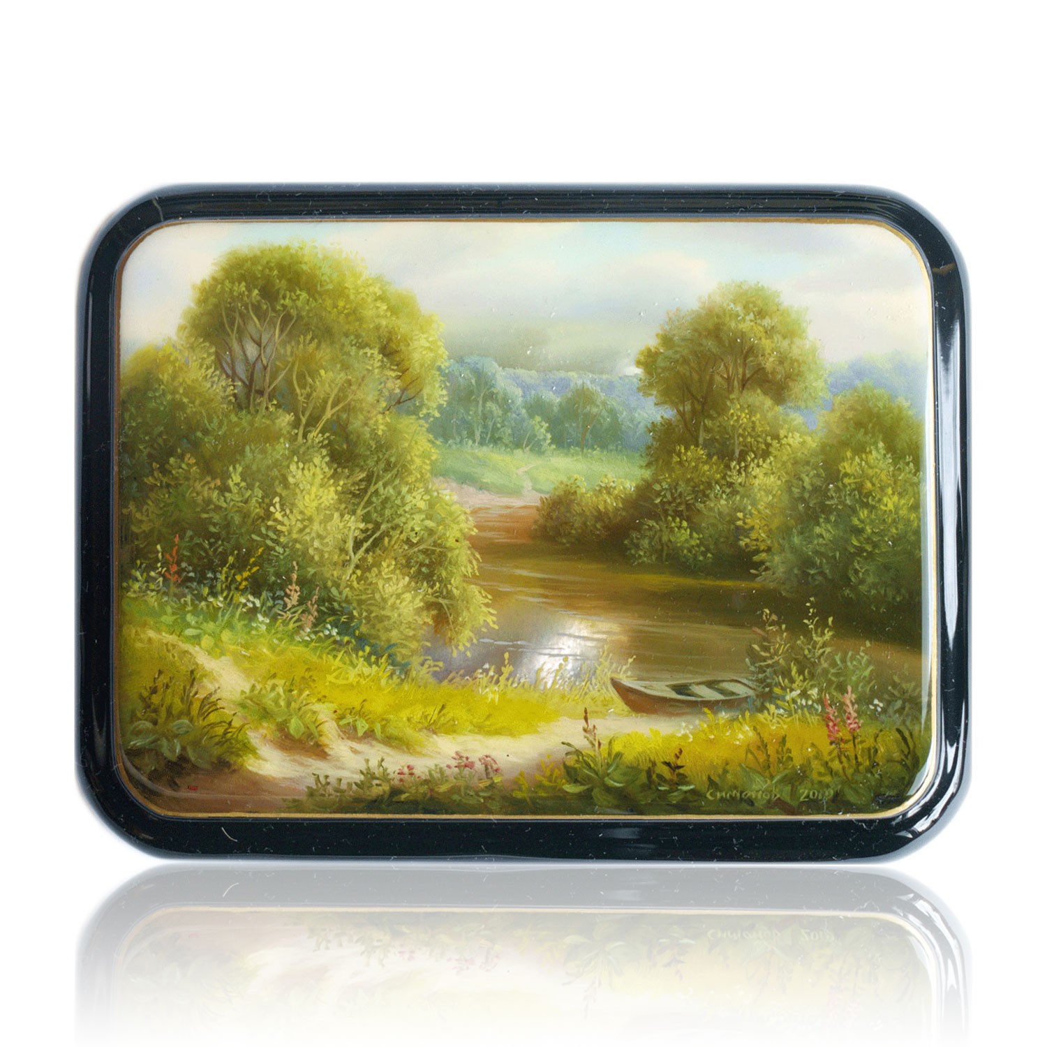 Шкатулка Федоскино - изделие из папье-маше, расписаное масляными красками с использованием сусального зотола и перламутра, покрытое несколькими слоями лака. Федоскинская лаковая миниатюра испольняется масляными красками в три-четыре слоя - последовательно выполняются замалёвок (общий набросок композиции), пропись или перемалёвка (более детальная проработка), лессировка (моделирование изображение прозрачными красками) и бликовка (завершения произведения светлыми красками, передающими блики на предметах).