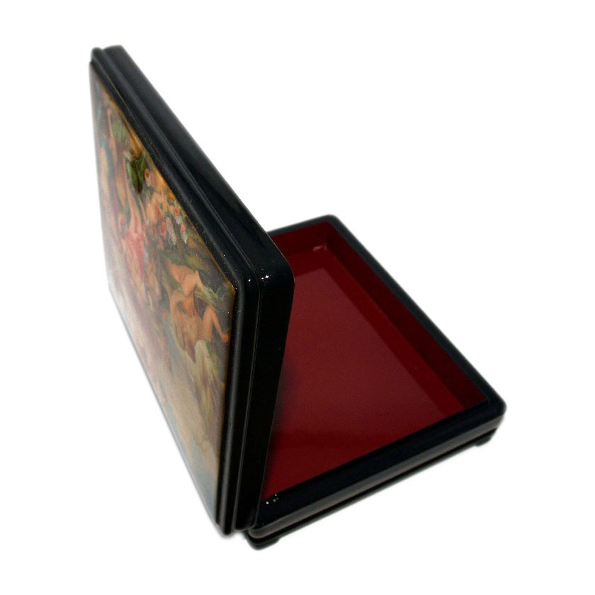 Шкатулка Федоскино - изделие из папье-маше, расписаное масляными красками с использованием сусального зотола и перламутра, покрытое несколькими слоями лака. Федоскинская лаковая миниатюра испольняется масляными красками в три-четыре слоя - последовательно выполняются замалёвок (общий набросок композиции), пропись или перемалёвка (более детальная проработка), лессировка (моделирование изображение прозрачными красками) и бликовка (завершения произведения светлыми красками, передающими блики на предметах).
