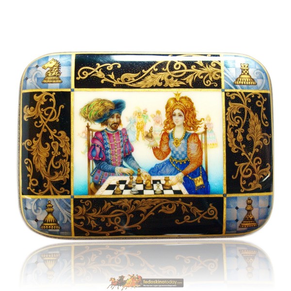 Шкатулка Федоскино - изделие из папье-маше, расписаное масляными красками с использованием сусального зотола и перламутра, покрытое несколькими слоями лака. Федоскинская лаковая миниатюра испольняется масляными красками в три-четыре слоя - последовательно выполняются замалёвок (общий набросок композиции), пропись или перемалёвка (более детальная проработка), лессировка (моделирование изображение прозрачными красками) и бликовка (завершения произведения светлыми красками, передающими блики на предметах).